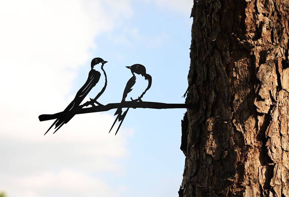 The swallows metal tree art silhouette is a beautiful, well-made addition to your backyard. Shop now this outdoor garden decor sculpture bird silhouette. Limited stock, all our metal art silhouettes sell out quickly.